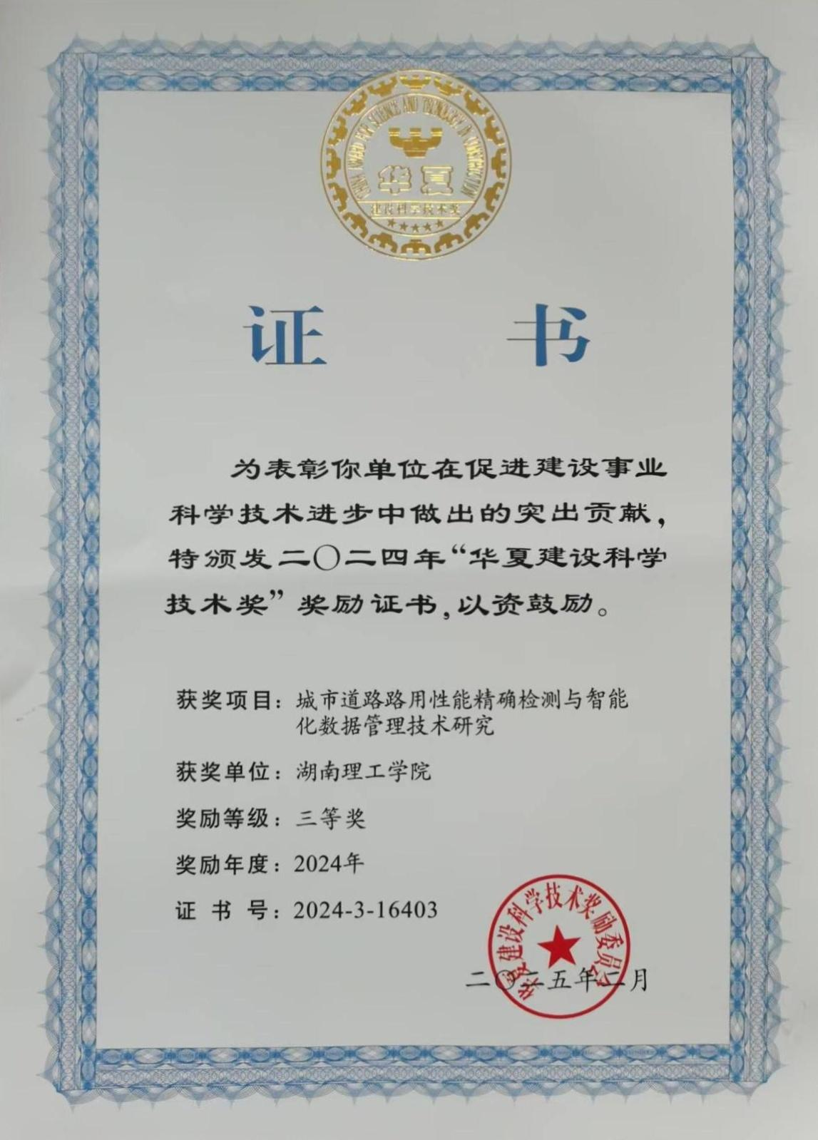 在华夏建设科学技术奖励委员会公布的2024年度科技奖授奖项目中,beat365手机版官网入口beat365手机版官网入口童小龙教授、吴建良高级工程师作为主要完成人,其参与的《城市道路路用性能精确检测与智能化数据管理技术研究》项目荣获华夏建设科技进步奖三等奖。