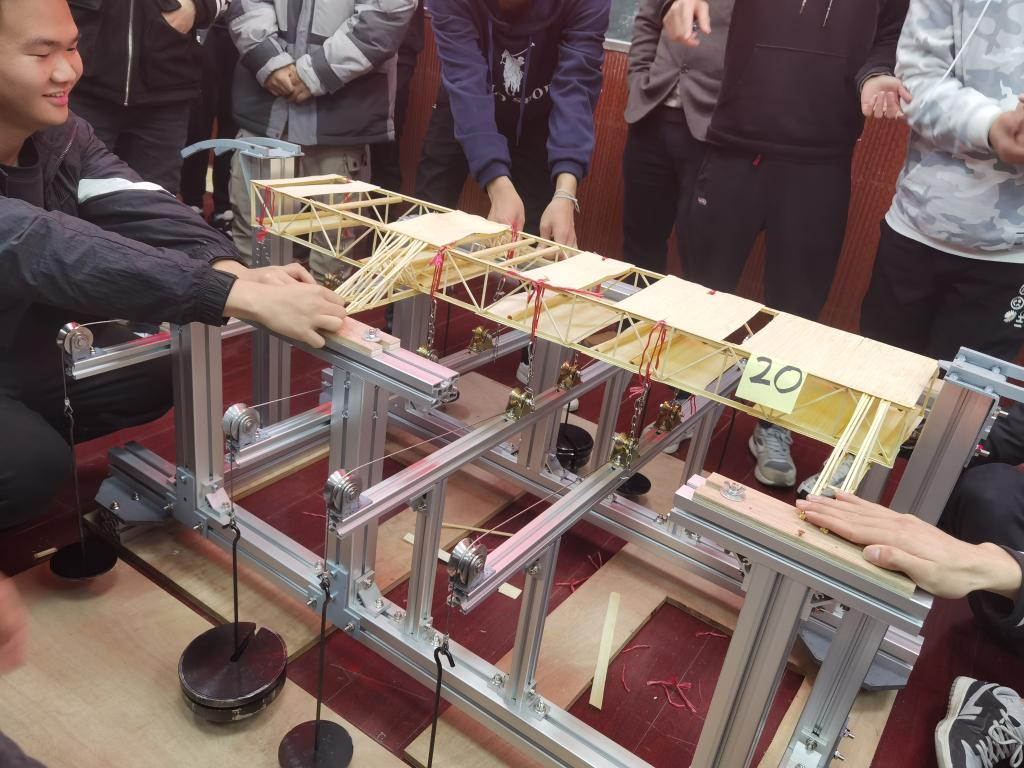 本次竞赛以“桥梁结构设计与制作”为题,要求员工2-3人一组,要求设计制作一座桥梁,承受分散作用的竖向集中静荷载以及局部转移荷载。在确保模型安全的前提下,还需要对模型的变形进行控制。采用竹制材料制作,具体结构型式不限。竞赛成绩按模型质量分、载荷分以及外观分以加权平均数进行计算,相同载荷分数下,模型质量轻者胜出。
