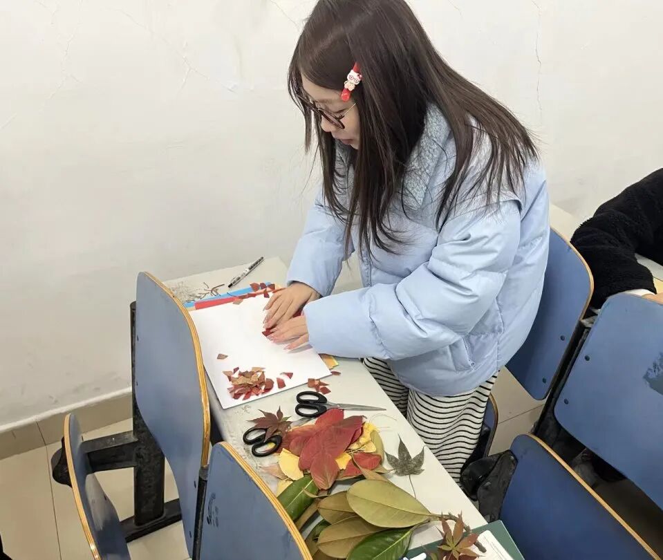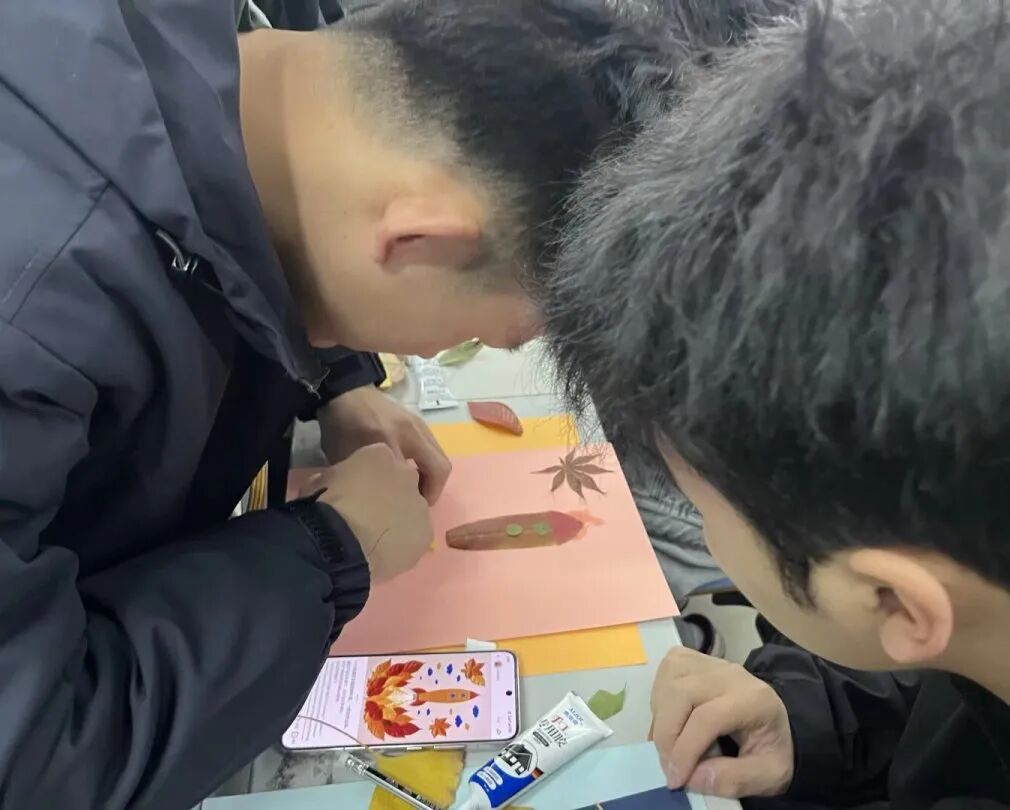 活动融合红色教育与劳动实践,组织学员采集秋叶进行剪贴画创作。各小组在组长带领下专心创作,大家手持剪刀精心修剪,用胶水将片片秋叶细心粘贴在卡纸上。原本零散的落叶,在团队的巧思与协作下,逐渐拼合成一幅幅富有爱国情怀的艺术作品,学员在动手实践中感悟革命精神。