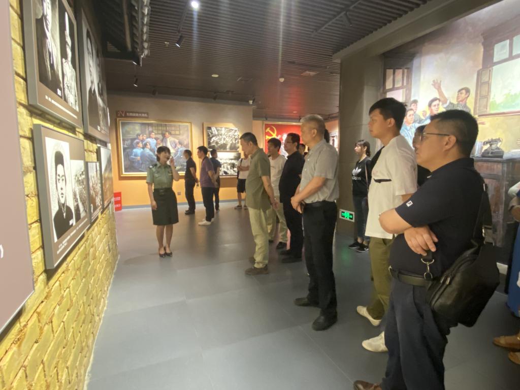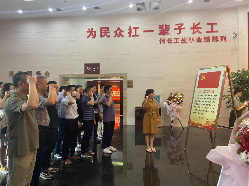 党委副书记钟铭金于何长工雕塑前带领全体党员重温入党誓词,在庄严的宣誓声中,党员们感受着革命先烈伟大的人格魅力和坚定的革命信仰。随后,全体党员师生有依序参观了壮志凌云、功勋卓著、培育精英等主题展厅,在讲解员的带领下参观何长工的革命历程,观看主题教育片,充分了解了何长工在建党、建军和建国三方面的丰功伟绩和传奇人生,学习何长工“为民众扛一辈子长工”的崇高品德和不朽精神。