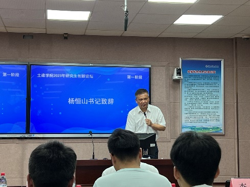 活动伊始,全体参会人员起立,奏唱国歌。随后,杨恒山书记对此次创新论坛致辞,他表示举办创新论坛的目的是激励广大研究生同学更加自律、自信、自强,提高学习的主动性、积极性、创造性进一步明确未来的发展奋斗的方向,同时希望能够在全院形成学风浓厚的学习氛围。
