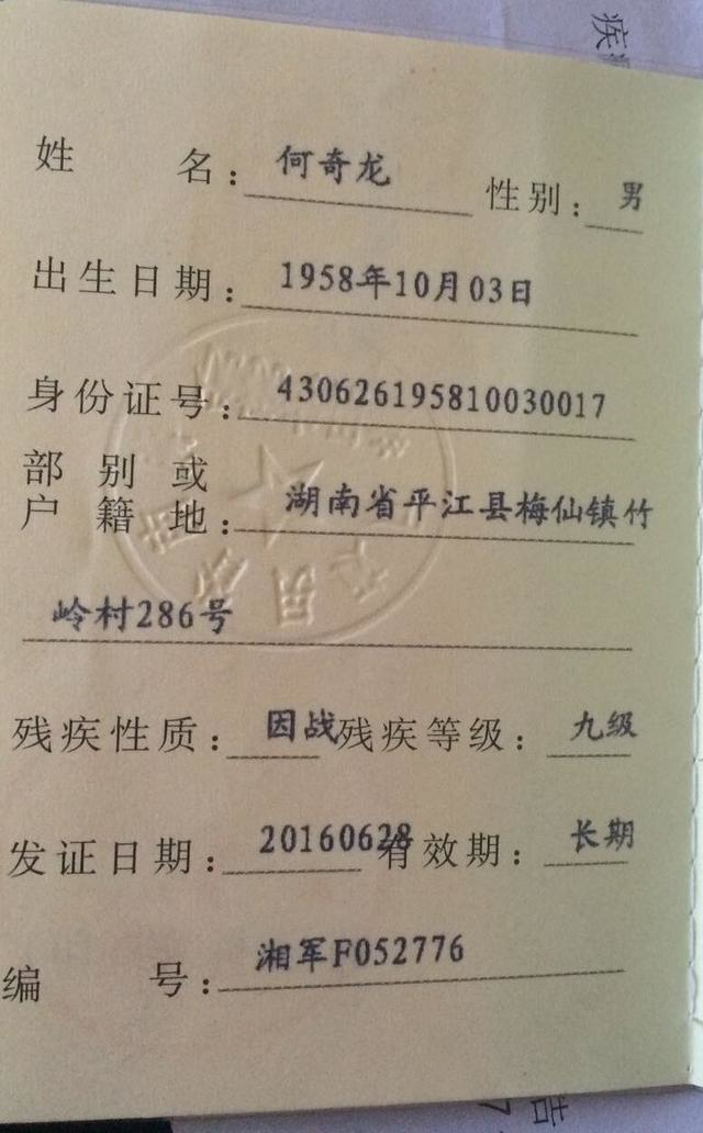 图为越战老兵何奇龙的残疾证书