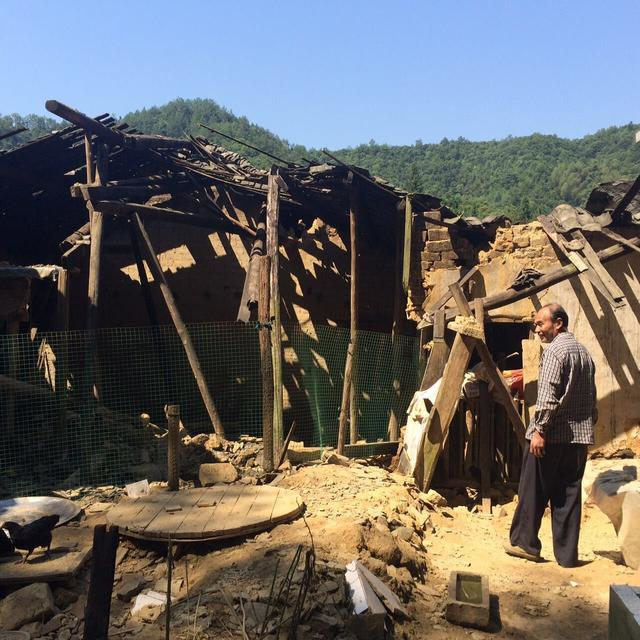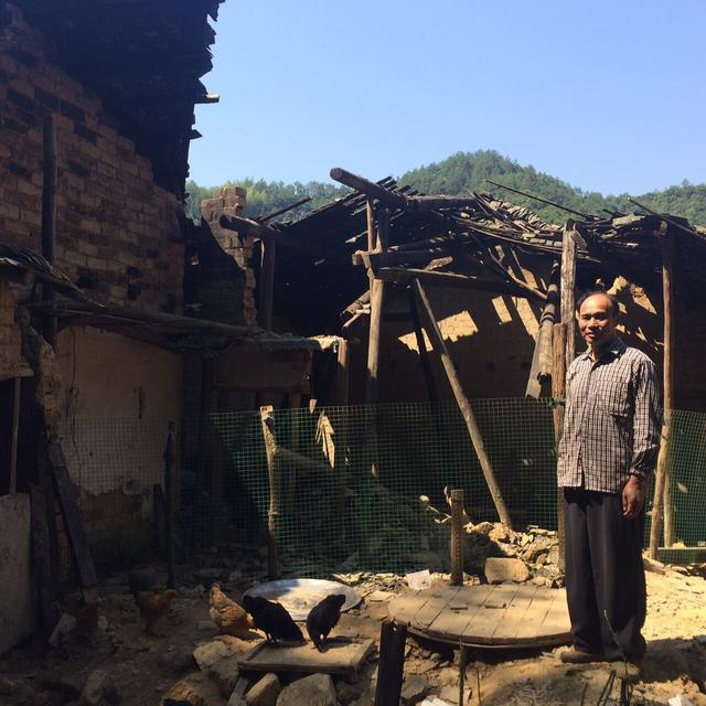 图为老党员何奇龙家被洪灾冲塌的房屋