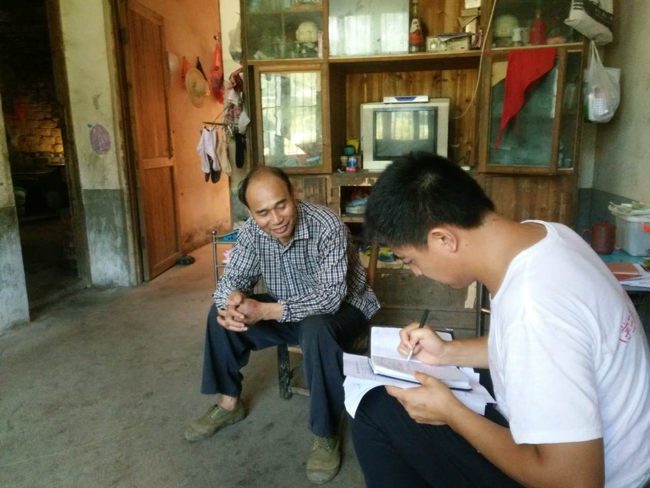 图为郭云峰老师在何奇龙同志家做认真细致的调研登记工作