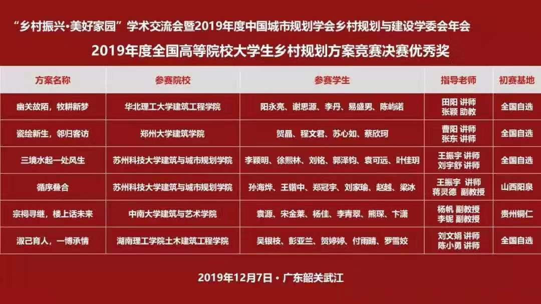 12月8日,2019年全国高等院校城乡规划专业老员工乡村规划方案竞赛落下帷幕。由beat365手机版官网入口城乡规划专业陈小勇和刘文娟老师带队指导,2016级城乡规划专业员工组成的参赛团队,在与同济大学、华南理工大学、重庆大学等国内高校团队PK中,公司学子分别荣获“乡村规划方案竞赛单元”决赛优秀奖1项,佳作奖2项。
