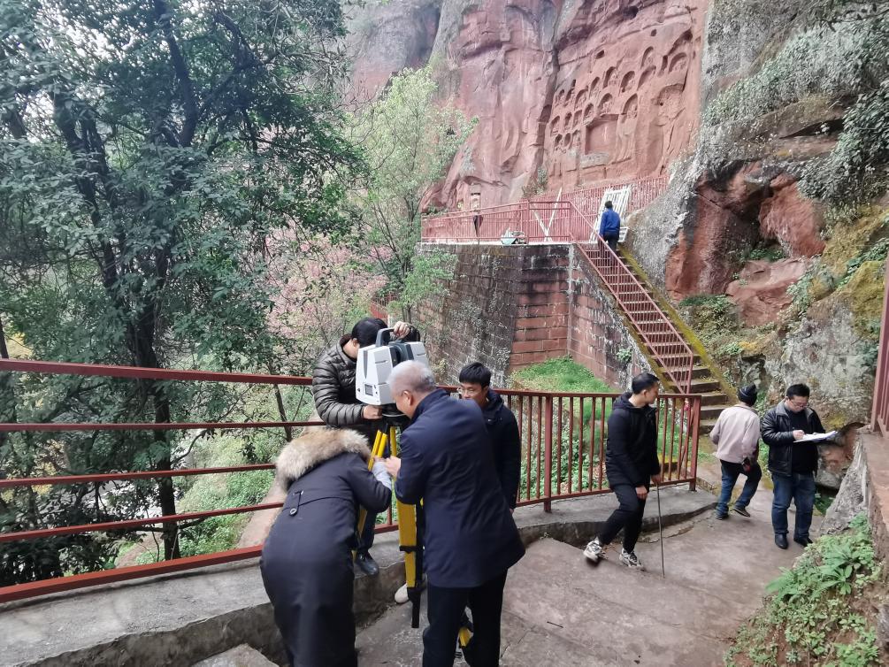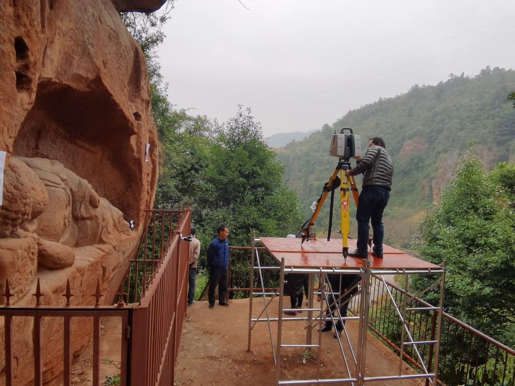 法华寺石窟前利用三维激光扫描仪收集数据