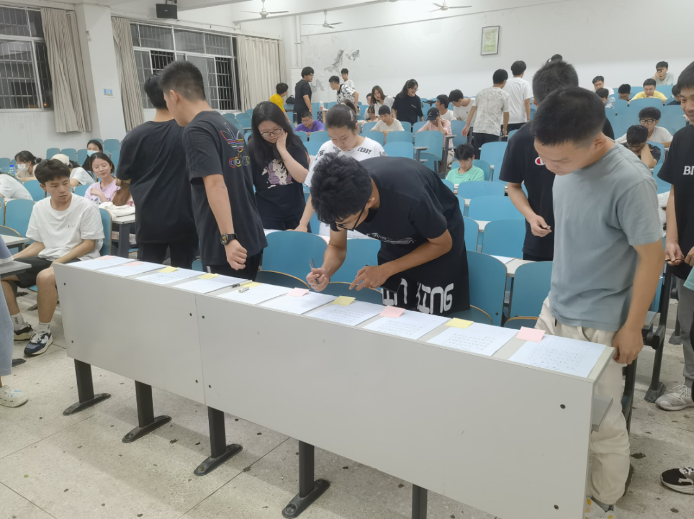 此次比赛选手需在指定教室,在规定时间内书写指定内容,将作品向现场观众展示并统计投票情况,将通过四轮淘汰机制晋级。最后由评委老师评定奖项归属,同时,会结合现场投票与赛后线上投票结果评定人气最佳奖项归属。参赛选手认真细致,注意要领,一笔一划书写出工程字特点,参赛现场井然有序。