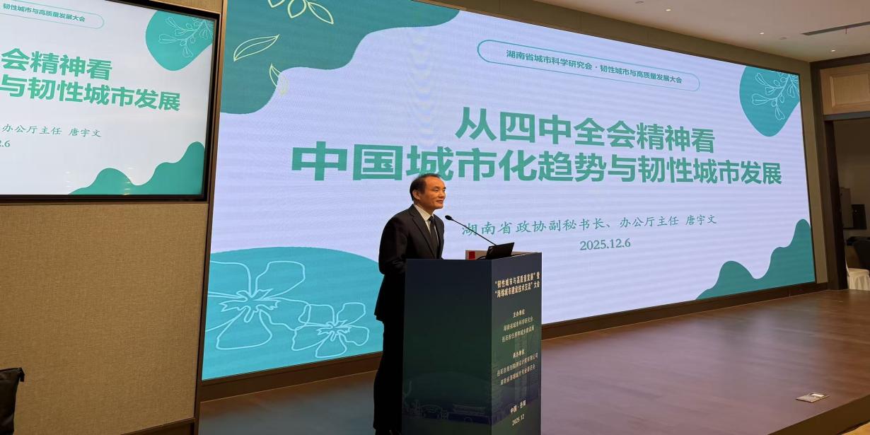 会上,湖南省政协副秘书长、办公厅主任唐宇文以党的二十届四中全会精神为指引,围绕韧性城市建设的背景、挑战和发展路径作交流发言。他指出未来要以数据为支撑、创新为动力、人民为中心,推动城市发展从“数量增长”向“质量提升”转型。通过统筹硬件与软件、短期与长期、政府与社会协同,结合技术创新、机制优化和公众参与,系统提升城市风险应对能力,建设“安全、绿色、智慧、包容”的韧性城市。