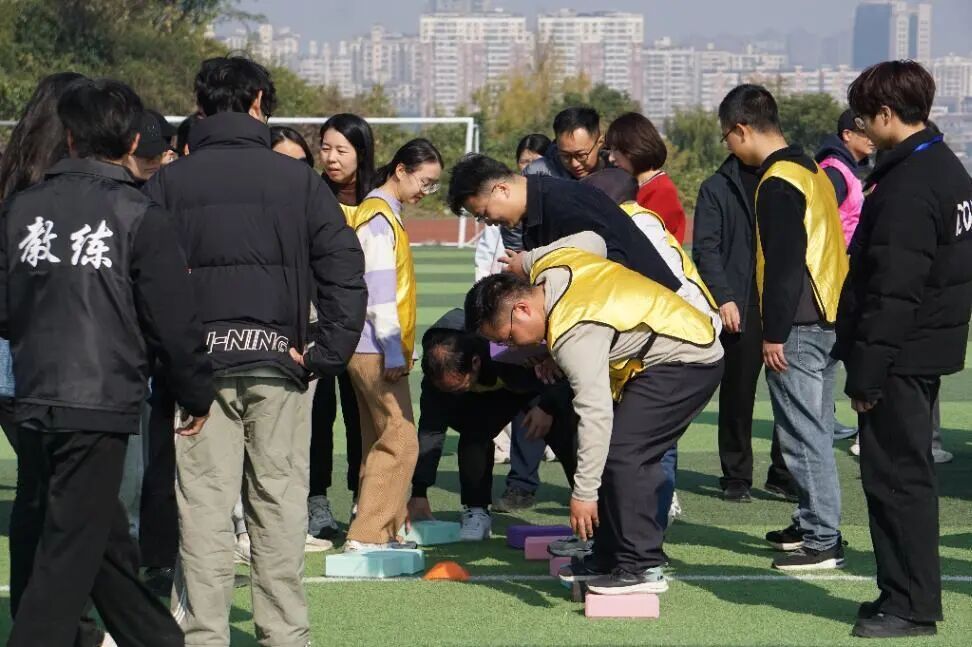 “智勇大冲关”赛道上,跨栏、平衡气垫、弧形通道等多重障碍依次排开,选手需以接力形式完成全程。起跑声落,首棒老师飞速冲刺,灵活越栏、平稳过垫、俯身钻网,随后精准将接力棒传递给下一位队员。各队配合默契,部分选手手脚并用提速闯关,现场喝彩声、呐喊声此起彼伏,每一次顺利交接都赢得阵阵欢呼。
